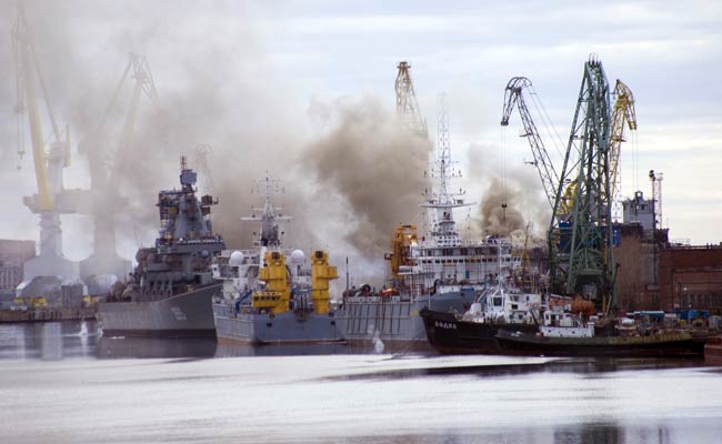 The agencies quoted sources as saying there were no weapons on board. Nobody was hurt, they said, although RIA news agency said the dry dock where the vessel was being repaired may have to be submerged under water to help extinguish the blaze.