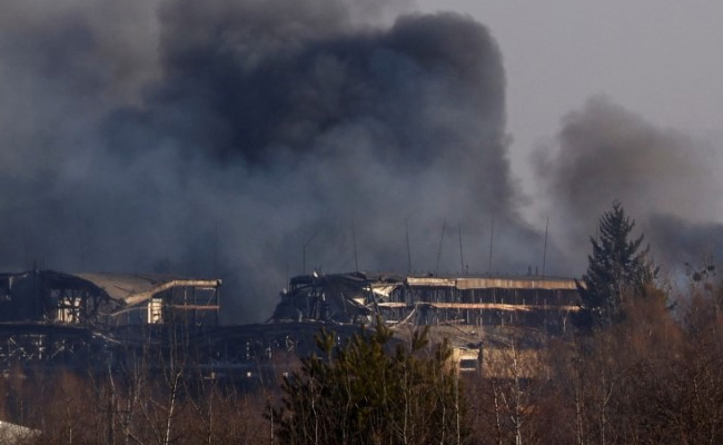 Ukraine war: Smoke rises from a factory building near Lviv airport (Reuters)