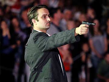 An actor dressed as Gavrilo Princip points a fake gun at another actor dressed as Archduke Franz Ferdinand (not seen) during a performance in the town of Visegrad June 28, 2014.