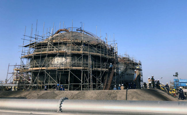 Reporters were shown repair work underway at both locations on Friday, with cranes erected around burnt-out stabilisation columns, which form part of oil-gas separation units.