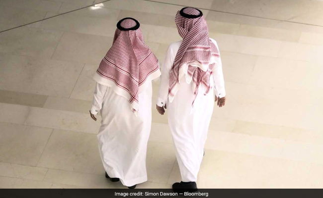 Two traditionally dressed men walk together in Dhahran, Saudi Arabia.