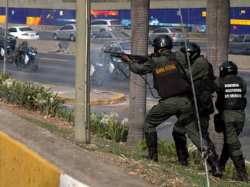 Bolivarian National Guards soldiers fire rubber bullets toward demonstrators during clashes at an anti-government protest in Caracas, Venezuela.