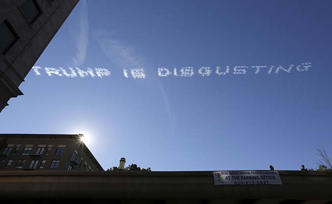 Five planes flew over the annual Rose Parade in Pasadena, California, on Friday writing messages in the sky that included "America is great! Trump is disgusting. Anybody but Trump, US," as onlookers craned their necks for a view.
