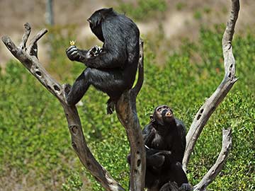 Chimpanzees eat in their enclosure at the Ol-Pejeta conservancy in Laikipia county on July 1, 2014 at a centre for rescued primates from illegal syndicates in animal trade.