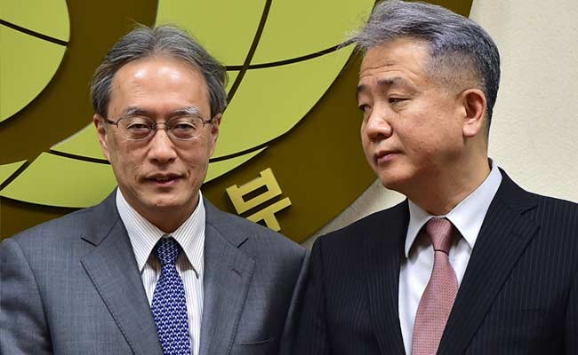Lee Sang-Deok, director-general of Northeast Asian affairs at the South Korean Foreign Ministry, with his Japanese counterpart Junichi Ihara, for security talks in Seoul on April 14, 2015.(AFP Photo)