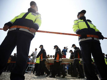File Photo: Rescue workers carry the bodies of passengers who were on the capsized Sewol passenger ship, which sank in the sea off Jindo.