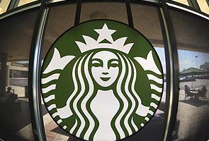 The Starbucks logo hangs on a window inside a newly designed Starbucks coffee shop in Fountain Valley, California