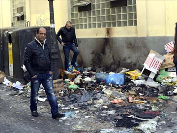 People walk past rubbish in the centre of Madrid on November 13, 2013