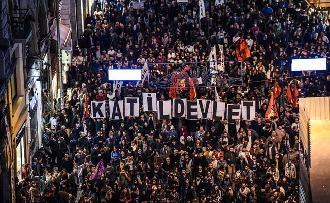 Placards reading "Killer state" are seen as protesters take part in a march against the deadly attack earlier in Ankara on October 10, 2015 at the Istiklal avenue in Istanbul. (AFP)