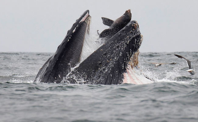 In a stunning photo, a wildlife photographer has captured a sea lion falling into the mouth of a humpback whale in what he calls a "once-in-a-lifetime" moment.