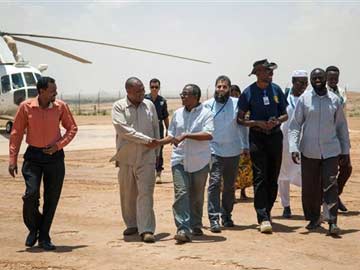 FILE: Sudan officials, members of the joint UN African Union Mission escort freed humanitarian workers (Associated Press photo)