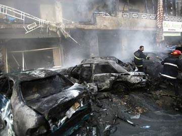 Civil defence members extinguish a fire at the site of an explosion in the Haret Hreik area, in the southern suburbs of the Lebanese capital Beirut on January 21, 2014.