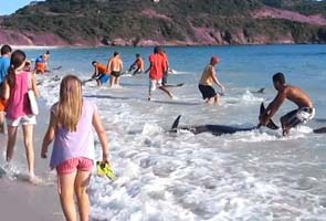 Dozens of people are seen swimming into the ocean and dragging the mammals by their tails in an effort to them back into deeper waters.