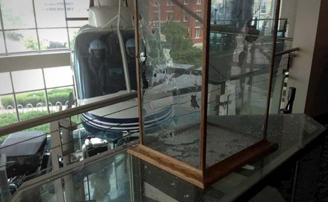 Dallas Police Department headquarters is seen riddled with bullet holes in Dallas, Texas in this handout photo released by the Dallas Police Department on June 13, 2015.(Reuters)
