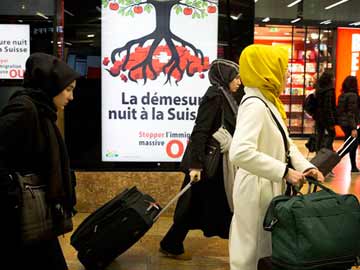 Women covered in veils pass by an election poster from the nationalist Swiss People’s Party, demanding a stop for immigration to Switzerland and reading: excess harms Switzerland , at the train station in Geneva, Switzerland.