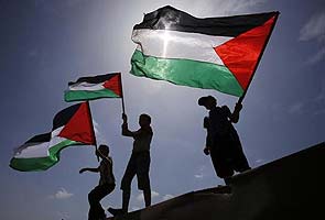 Boys wave Palestinian flags during a protest near the border between Israel and the northern Gaza Strip