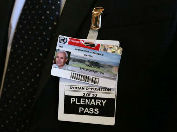 An official badge worn by Syrian opposition leader Burhan Ghalioun is pictured as he speaks to Reuters in Montreux on January 23, 2014.