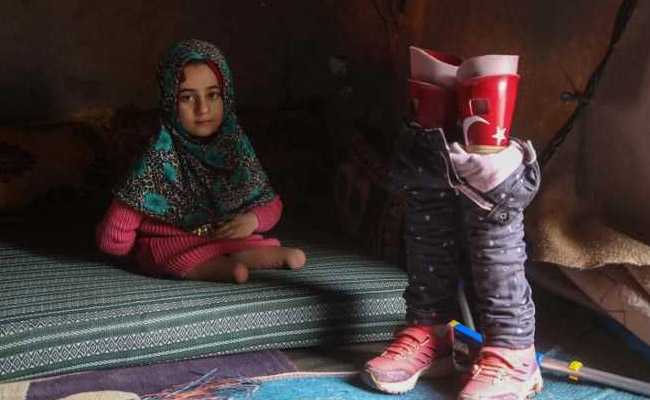 Eight-year-old Maya Merhi had to struggle around a Syrian displaced persons camp on artificial limbs made of plastic tubing and tin cans.