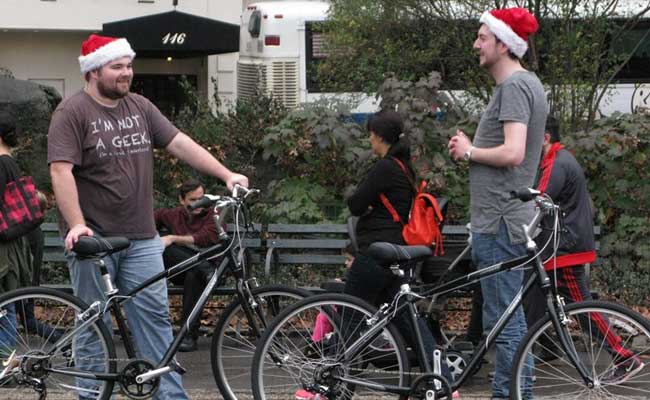 Two men in Santa hats prepare for a bike ride in Central Park on December 24 (Agence France-Presse photo)