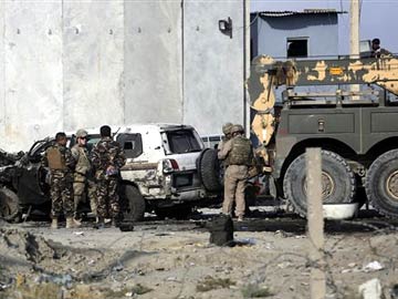 US and Afghan security forces inspect the site of a suicide attack in Kabul, Afghanistan. (Associated Press)