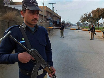 Pakistani police officer stands guard at checkpoint on a road leading to the site of bomb explosion in Bannu, Pakistan on Sunday Jan. 19, 2014