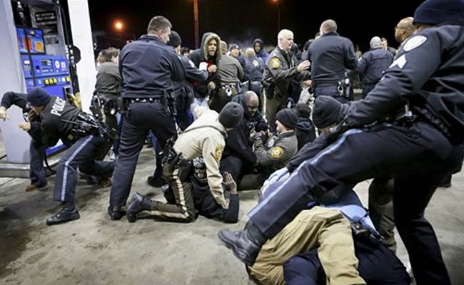 Police try to control a crowd Wednesday, Dec. 24, 2014, on the lot of a gas station following a shooting Tuesday in Berkeley, Missouri. (AP)