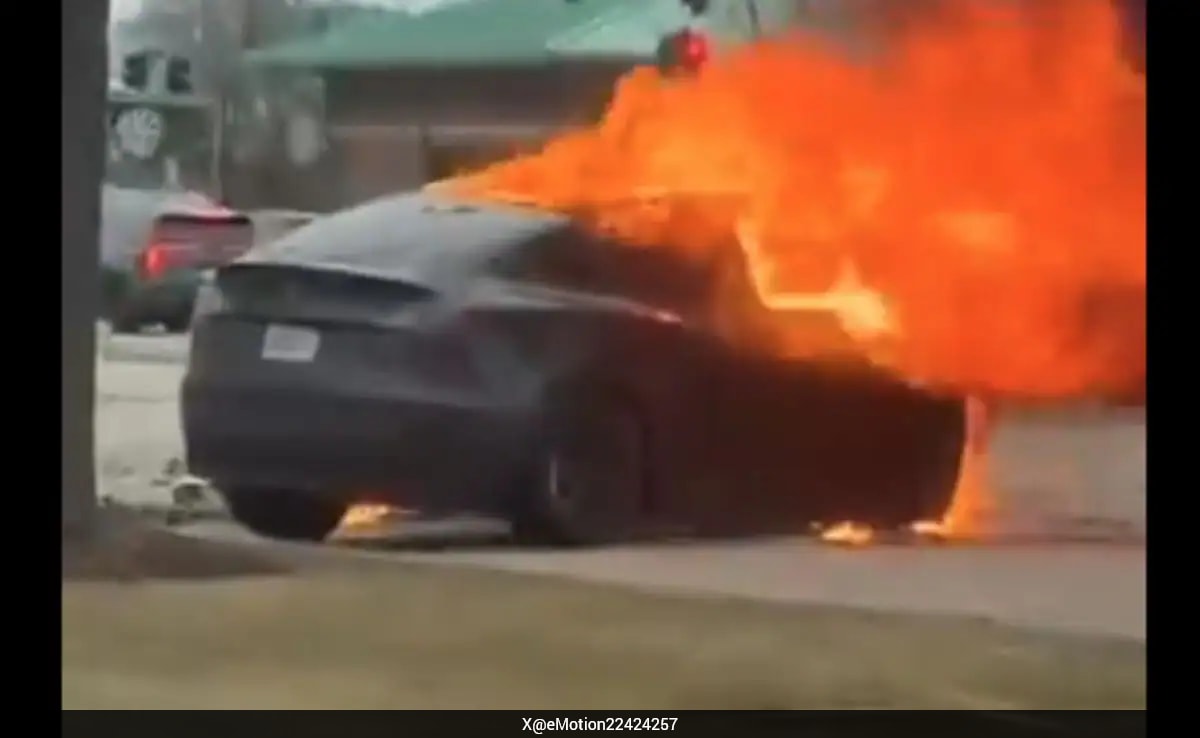 A video, filmed by a bystander from a distance, showed a black Tesla engulfed in flames, with thick black smoke billowing from the vehicle as it burned on the roadway.