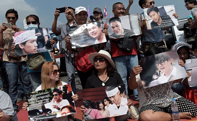 Supporters hold pictures of detained students in Bangkok on July 7, 2015. (Agence France-Presse)
