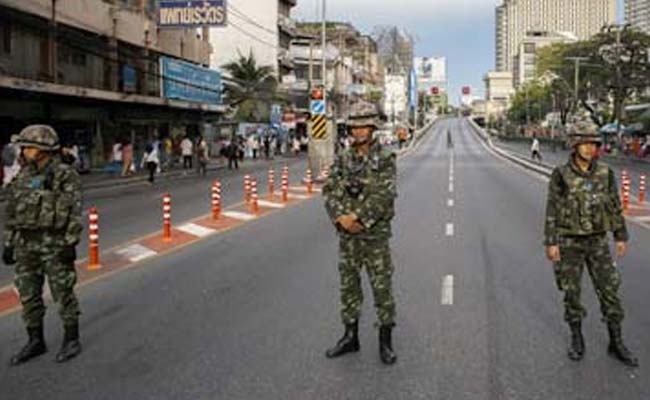 Thai soldiers stand guard along roads blocked around the Victory Monument. (Reuters)