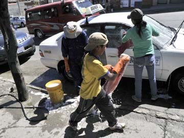 A boy helps hils older siblings to wash a car in a street of La Paz on May 7, 2014