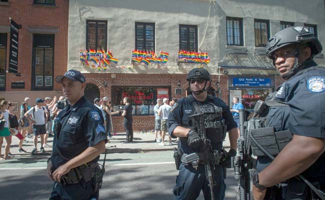 In reaction to the mass shooting at a gay nightclub in Orlando, Florida members of the NYPD Counterterrorism Unit stand outside the Stonewall Inn near a vigil for the victims in New York on June 12, 2016. (AFP Photo)