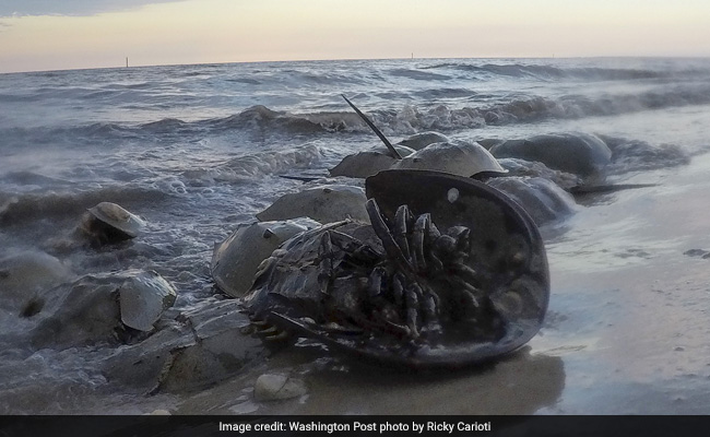 Horseshoe crabs come ashore to mate and lay eggs during a new moon at Kitts Hummock Beach in Delaware