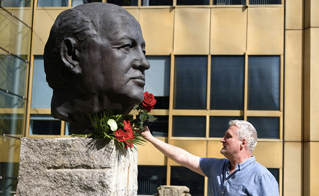 Roses are placed on a sculpture of Mikhail Gorbachev