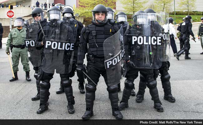 Police officers in riot gear outside Mondawmin Mall in Baltimore, April 27, 2015