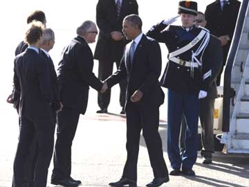US president Barack Obama (2nd R) shakes hands with Dutch Foreign Minister Frans Timmermans (3rd R) after disembarking from Air Force One upon his arrival at Schiphol Amsterdam Airport on March 24, 2014 to attend the two-day Nuclear Security Summit (NSS)