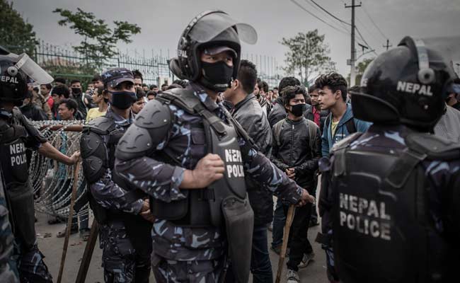 Nepalese riot police officials stand alert on a street in Kathmandu on April 29, 2015. (Agence France-Presse)
