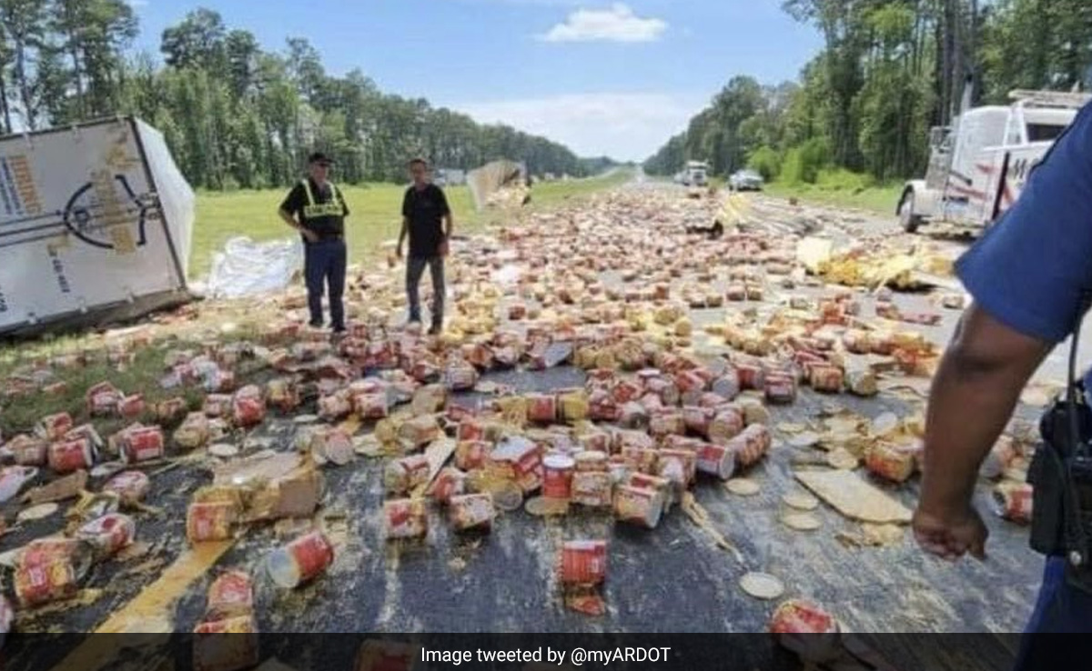 The Arkansas Department of Transportation said the truck was loaded with cans of nacho cheese when it was involved in a collision with another vehicle on Interstate 30, near Prescott.