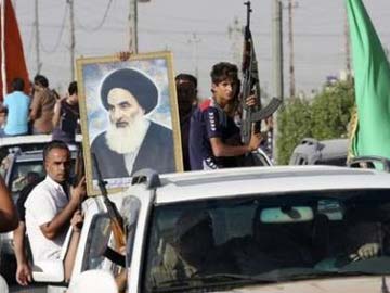 Volunteers, who have joined the Iraqi Army to fight against predominantly Sunni militants, carry weapons and a portrait of Grand Ayatollah Ali al-Sistani during a parade in the streets in Baghdad's Sadr city June 14, 2014.