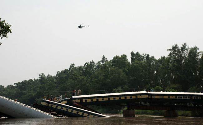 A train carrying hundreds of Pakistan soldiers and their families plunged several feet into a canal today when a bridge collapsed in the country's east in what the army suspects was sabotage, officials said.