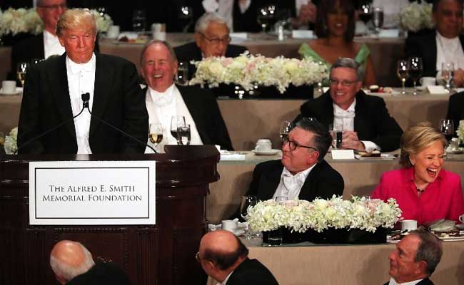 Hillary Clinton and Donald Trump speaking during the Charity Dinner.