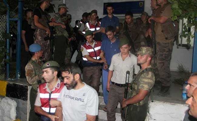 Turkish gendarmeries escort fugitive commandos who were involved in a bid to seize Erdogan. (Reuters)
