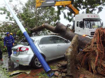 Workers remove a tree that fell on a car in the aftermath of Typhoon Haiyan after it made landfall in Sanya in south China's Hainan province on November 10, 2013.