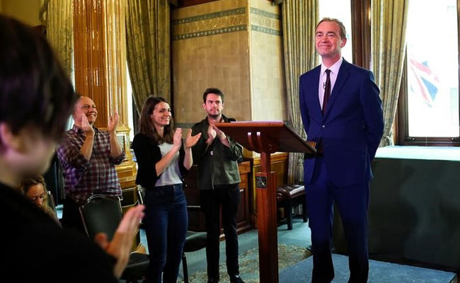 Tim Farron, leader of Britain's Liberal Democrat Party, addresses the media after Britain's election.