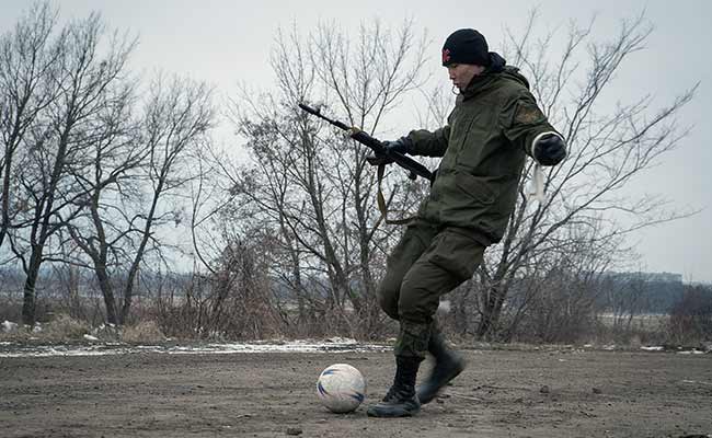 A pro-Russian separatist plays with a ball at a checkpoint near the eastern Ukrainian city of Uglegorsk. (Agence France-Presse)