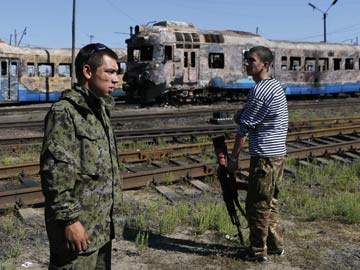 Pro-Russian separatists stand in front of destroyed trains in Ukrainian.(Reuters)