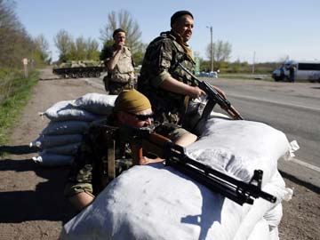 Ukrainian soldiers man a checkpoint in the village of Malinivka, east of Slaviansk in eastern Ukraine on April 24, 2014