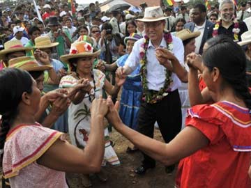 Wearing a straw hat, a necklace of flowers and a big grin, Ban joined in a folk dance with men and women from the Santa Rita community in Bolivia's eastern Concepcion region.
