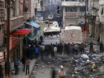 Syrian Arab Red Crescent trucks stand in the besieged neighbourhoods of Homs to supply humanitarian aid on February 8, 2014