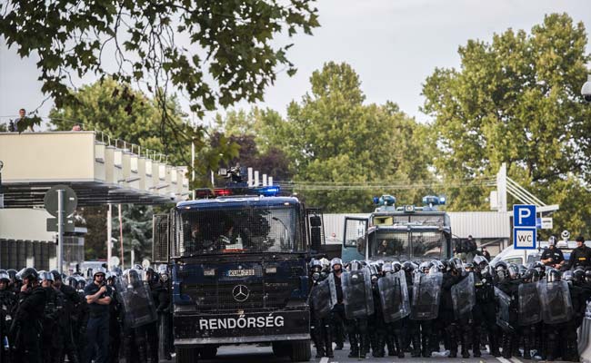 Hungarian anti- riot police stand guard at the Hungarian border with Serbia near the town of Horgos on September 16, 2015. (AFP)