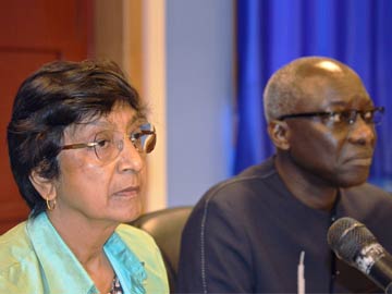The UN High Commissioner for Human Rights, Navi Pillay (L), and Special Advisor for the Prevention of Genocide and Special Advisor for the Prevention of Genocide, Adama Dieng (R) speak during a press conference in Juba on April 30, 2014.